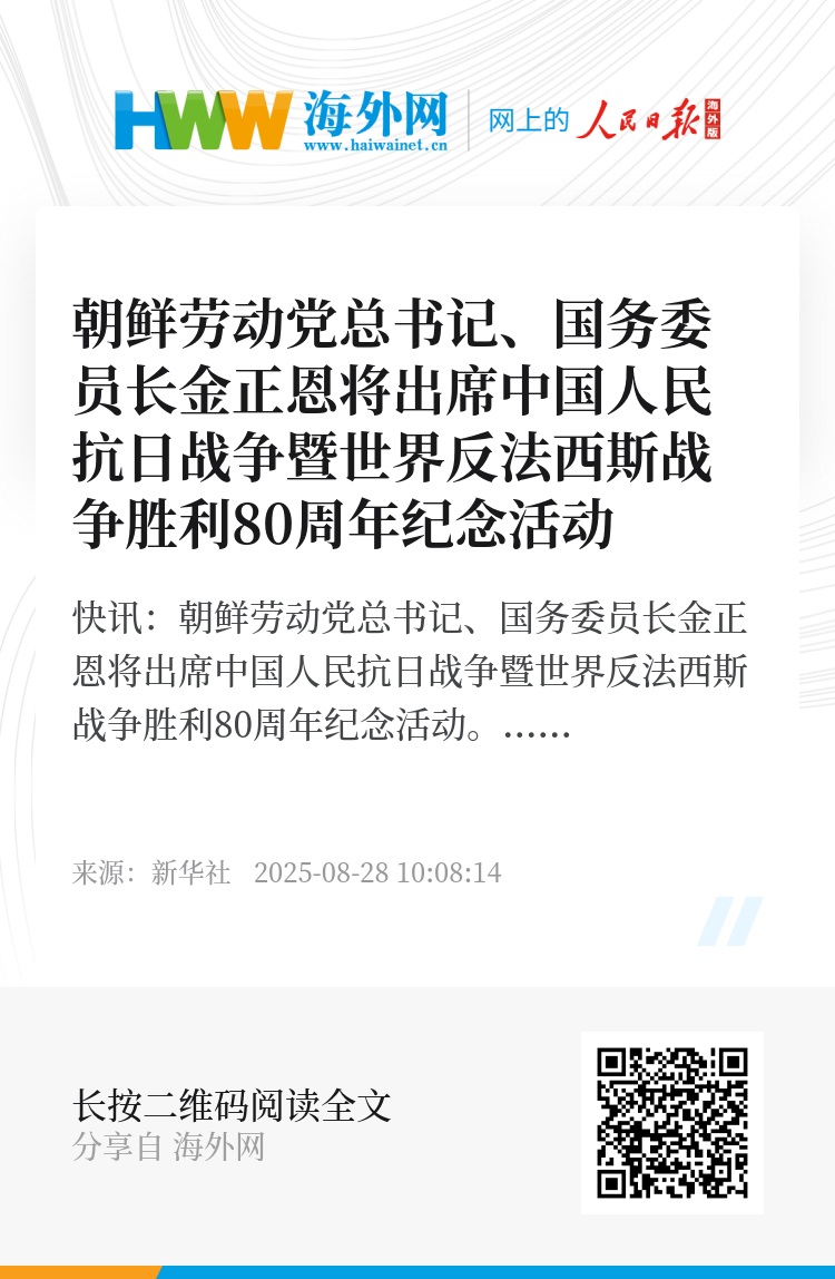 新华社快讯:朝鲜劳动党总书记、国务委员长金正恩将出席中国人民抗日战争暨世界反法西斯战争胜利80周年纪念活动。