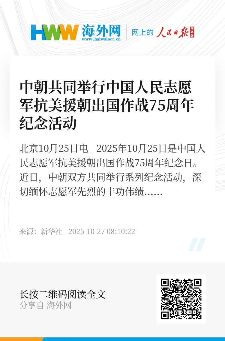 新华社北京10月25日电 2025年10月25日是中国人民志愿军抗美援朝出国作战75周年纪念日。近日,中朝双方共同举行系列纪念活动,深切缅怀志愿军先烈的丰功伟绩。