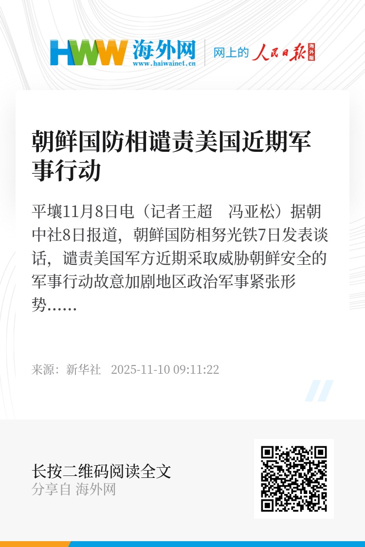 新华社平壤11月8日电(记者王超 冯亚松)据朝中社8日报道,朝鲜国防相努光铁7日发表谈话,谴责美国军方近期采取威胁朝鲜安全的军事行动故意加剧地区政治军事紧张形势,表示朝方将针对威胁采取更具进攻性的行动。