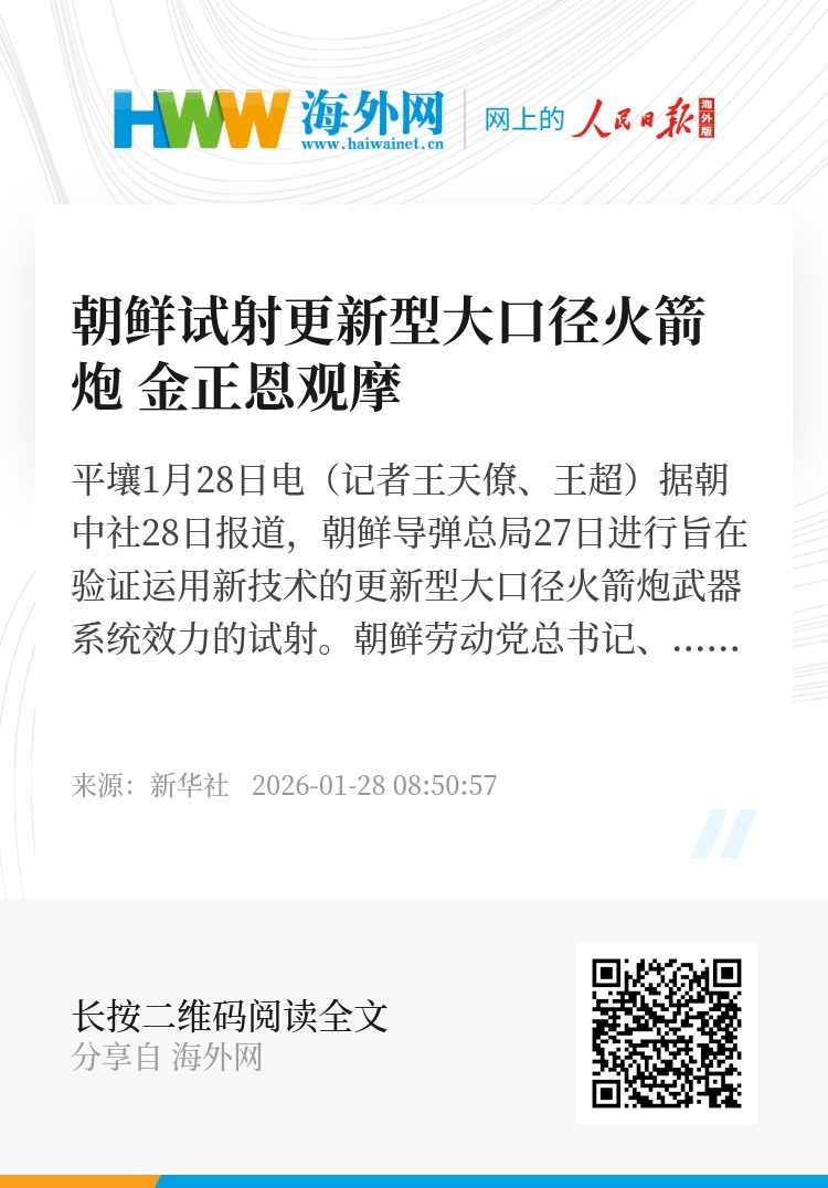 新华社平壤1月28日电(记者王天僚、王超)据朝中社28日报道,朝鲜导弹总局27日进行旨在验证运用新技术的更新型大口径火箭炮武器系统效力的试射。朝鲜劳动党总书记、国务委员长金正恩观摩了试射。