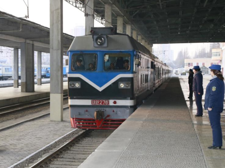 3月12日,一趟从中国丹东开往朝鲜平壤的国际旅客列车抵达平壤站。新华社记者 王超 摄