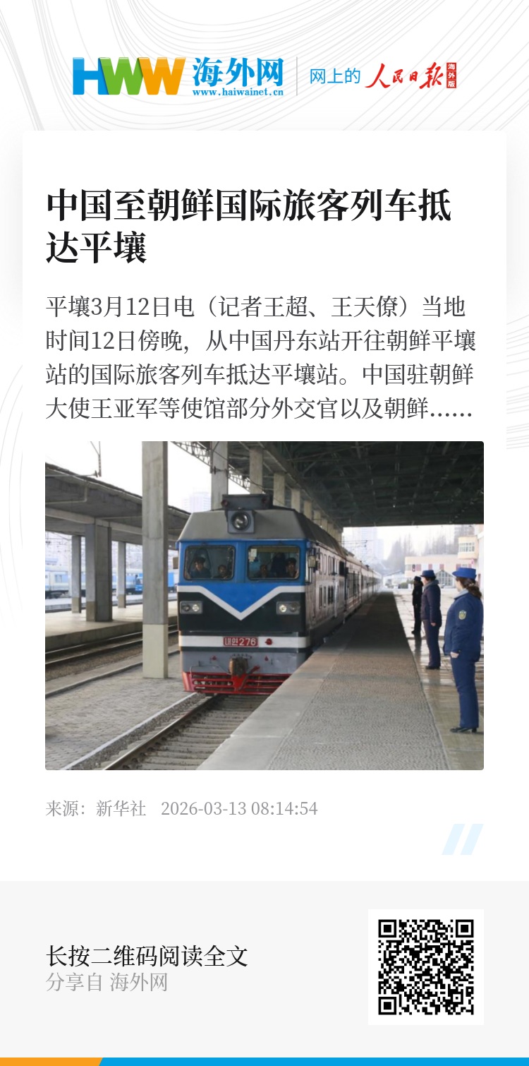 新华社平壤3月12日电(记者王超、王天僚)当地时间12日傍晚,从中国丹东站开往朝鲜平壤站的国际旅客列车抵达平壤站。