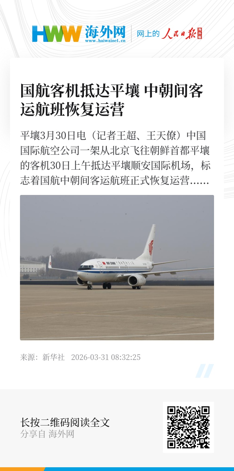 新华社平壤3月30日电(记者王超、王天僚)中国国际航空公司一架从北京飞往朝鲜首都平壤的客机30日上午抵达平壤顺安国际机场,标志着国航中朝间客运航班正式恢复运营。