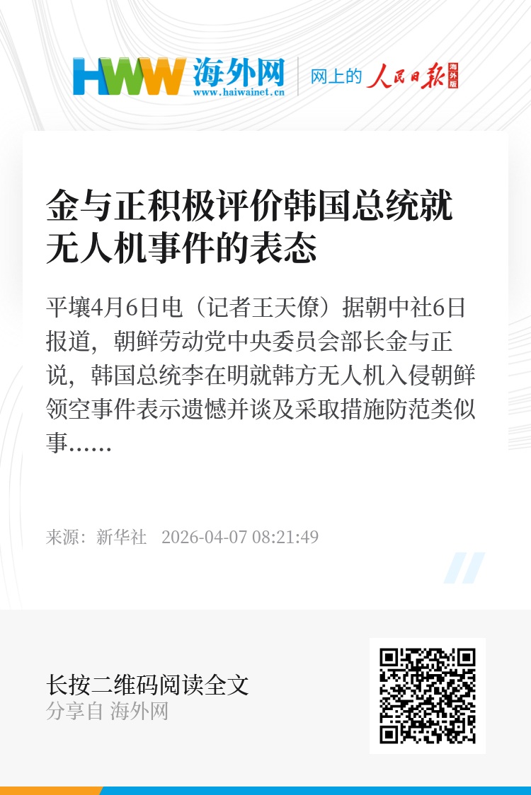 新华社平壤4月6日电(记者王天僚)据朝中社6日报道,朝鲜劳动党中央委员会部长金与正说,韩国总统李在明就韩方无人机入侵朝鲜领空事件表示遗憾并谈及采取措施防范类似事件再发,这是明智之举。