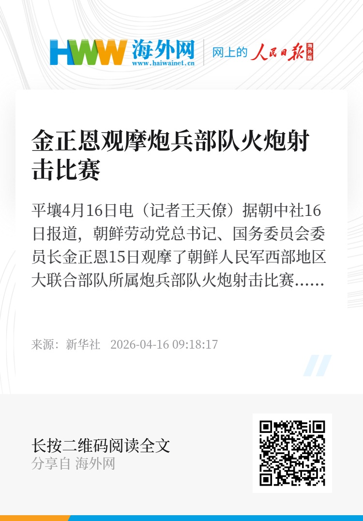 新华社平壤4月16日电(记者王天僚)据朝中社16日报道,朝鲜劳动党总书记、国务委员会委员长金正恩15日观摩了朝鲜人民军西部地区大联合部队所属炮兵部队火炮射击比赛。