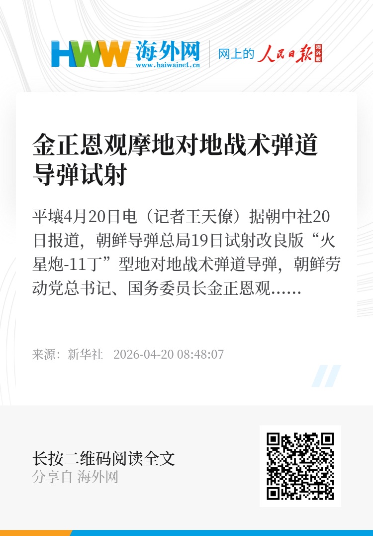 新华社平壤4月20日电(记者王天僚)据朝中社20日报道,朝鲜导弹总局19日试射改良版“火星炮-11丁”型地对地战术弹道导弹,朝鲜劳动党总书记、国务委员长金正恩观摩试射。