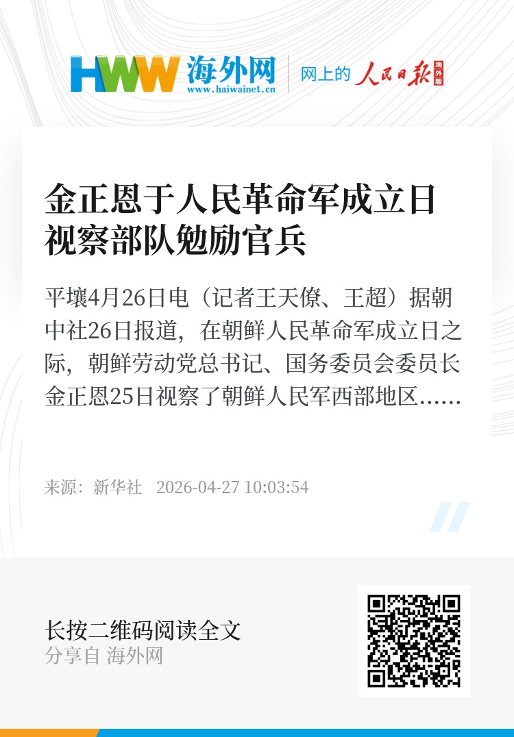新华社平壤4月26日电(记者王天僚、王超)据朝中社26日报道,在朝鲜人民革命军成立日之际,朝鲜劳动党总书记、国务委员会委员长金正恩25日视察了朝鲜人民军西部地区机械化步兵师所属联合部队,并观摩了轻步兵部队迫击炮兵射击比赛。
